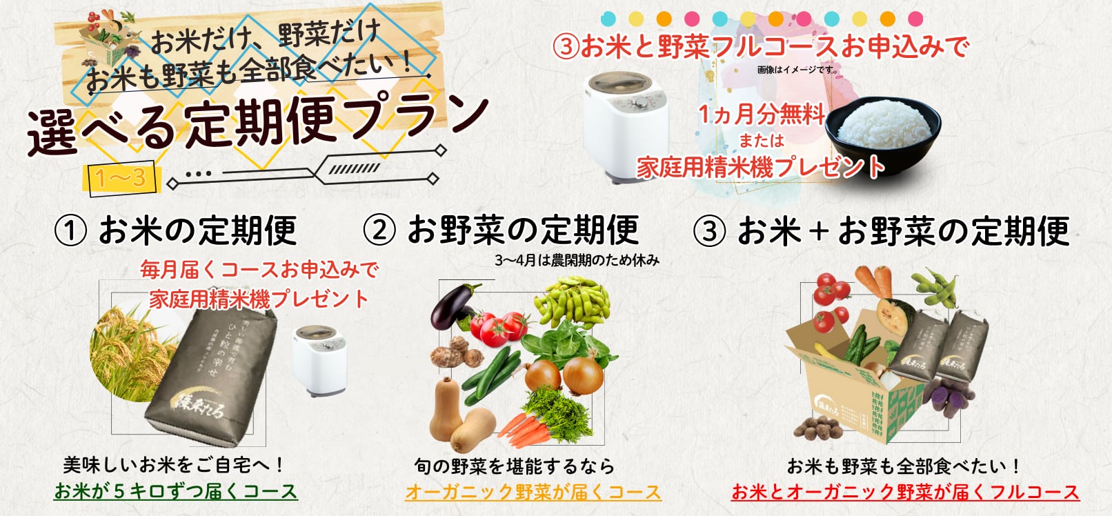 ※お米とオーガニック野菜の定期便セット申込で『1か月無料 or 精米機プレゼント』もご用意していますので、ご検討ください。